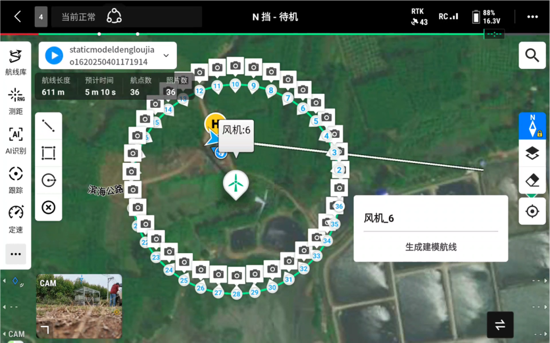系统自动生成建模航线后,Matrice 4 系列无人机自主执行巡检任务,通过全方位环绕飞行的方式,精准采集风机多角度的高清影像数据。