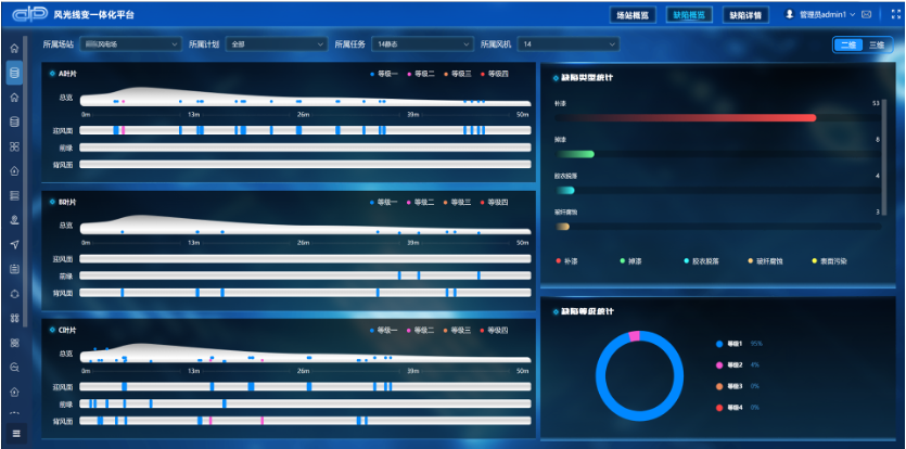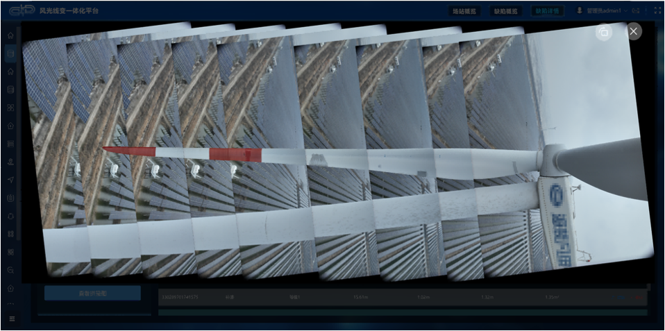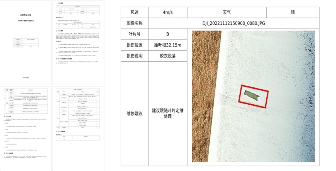 系统自动将无人机拍摄的照片进行智能拼接,生成完整的风机全景图像。基于该图像,智能检测算法可精准识别各类缺陷,准确率高达 90%,并自动生成可视化分析报告。这大幅减少了人工分析的工作量,综合成本较传统方法降低了 65%,为后续维护决策提供了科学依据
